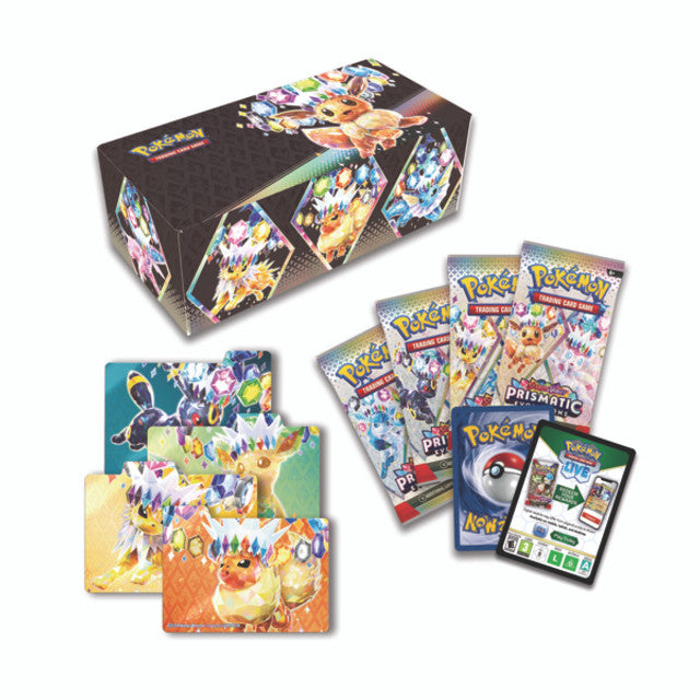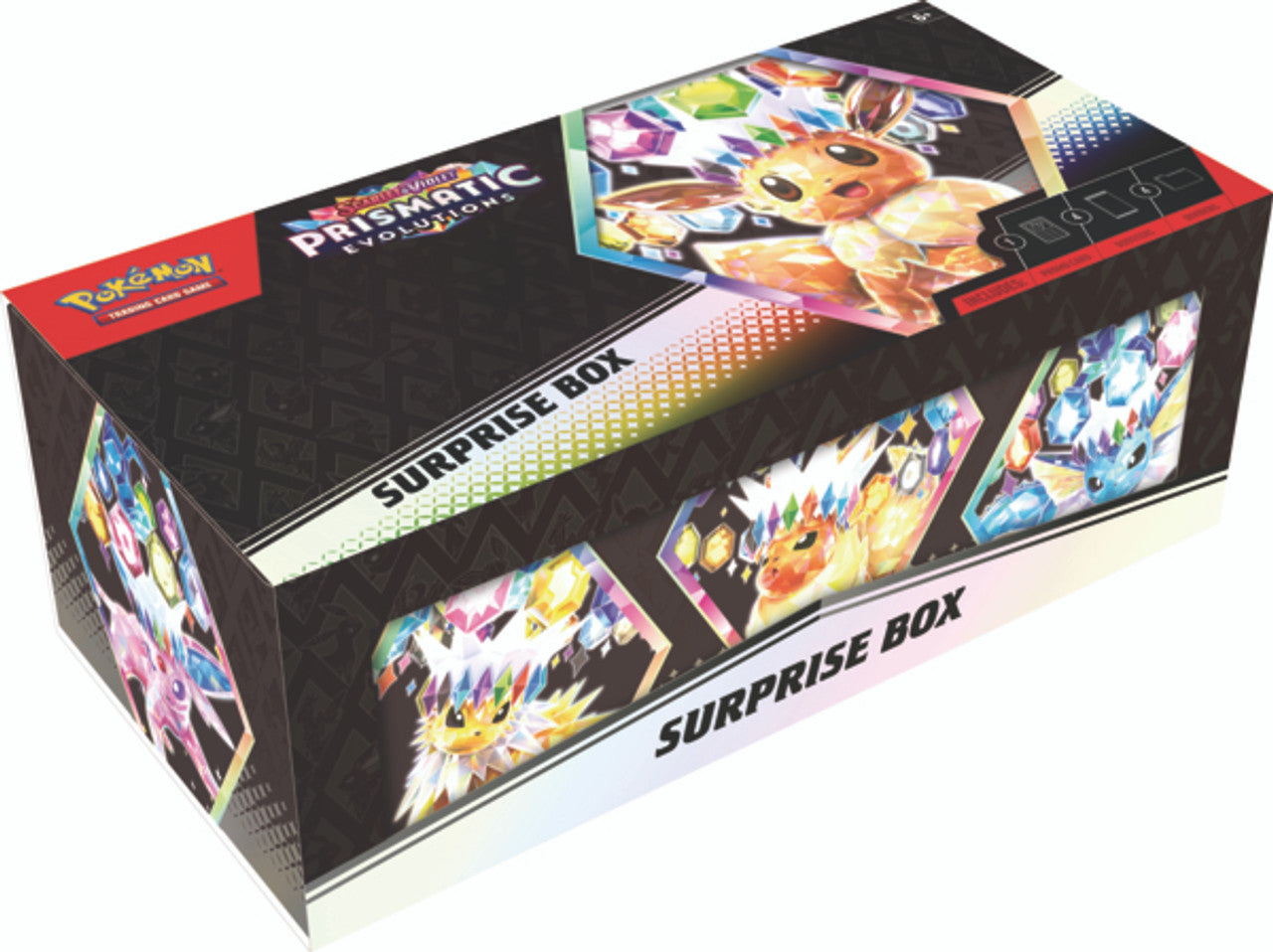 Eevee and its Evolutions all have unique strengths to discover—and they get even more powerful when they appear as Pokémon ex! In this collection, you get one randomly selected foil promo card featuring Eevee or one of its Evolutions as a Stellar Tera Pokémon ex, plus four booster packs from the special Scarlet & Violet—Prismatic Evolutions expansion. Then use the included dividers to organize and store your new cards inside this box! Unwrap 1 of 9 special foil promo cards and a handful of Pokémon TCG booster packs! The Pokémon TCG: Scarlet & Violet—Prismatic Evolutions Surprise Box includes: